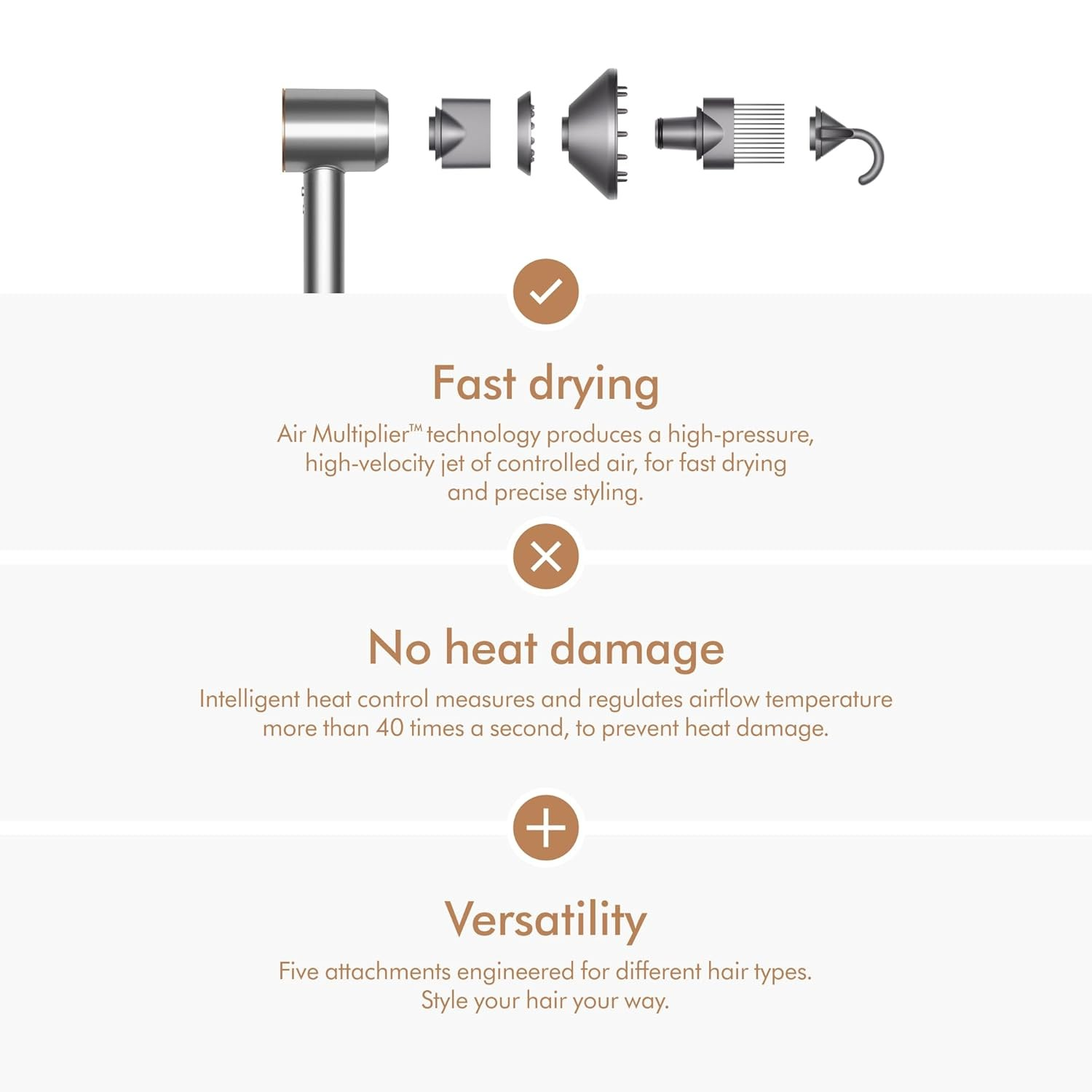 El motor digital V9 de alta velocidad seca el cabello en la mitad del tiempo que otros secadores, sin comprometer la calidad del peinado.